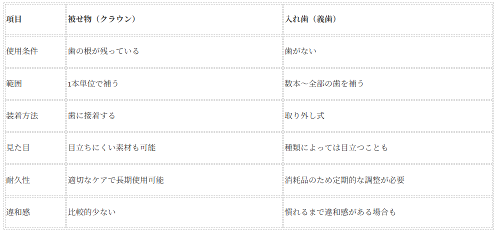 「被せ物」と「入れ歯」は、どちらも歯の機能を回復するための治療法ですが、使用する条件や構造、装着方法に大きな違いがあります。